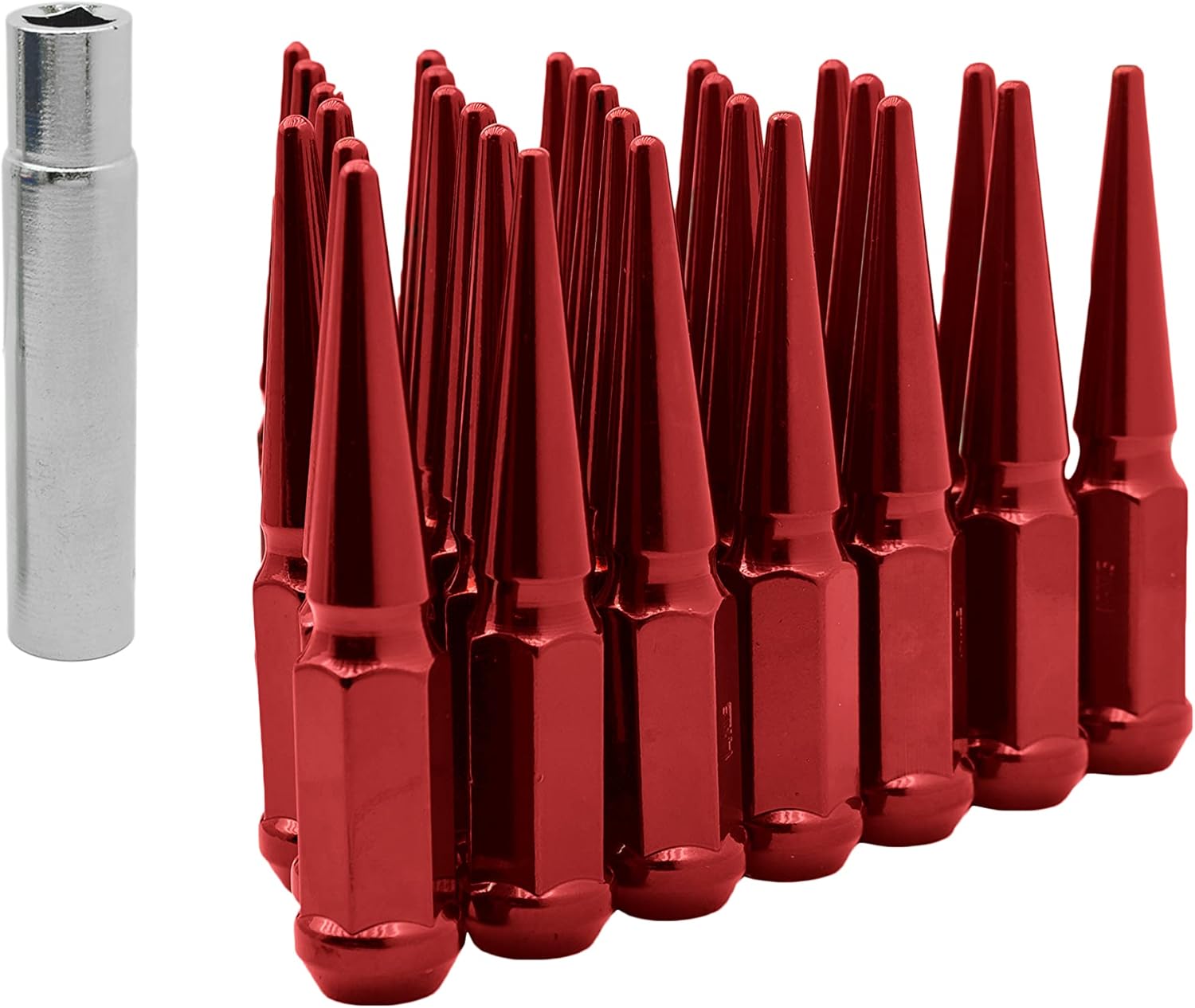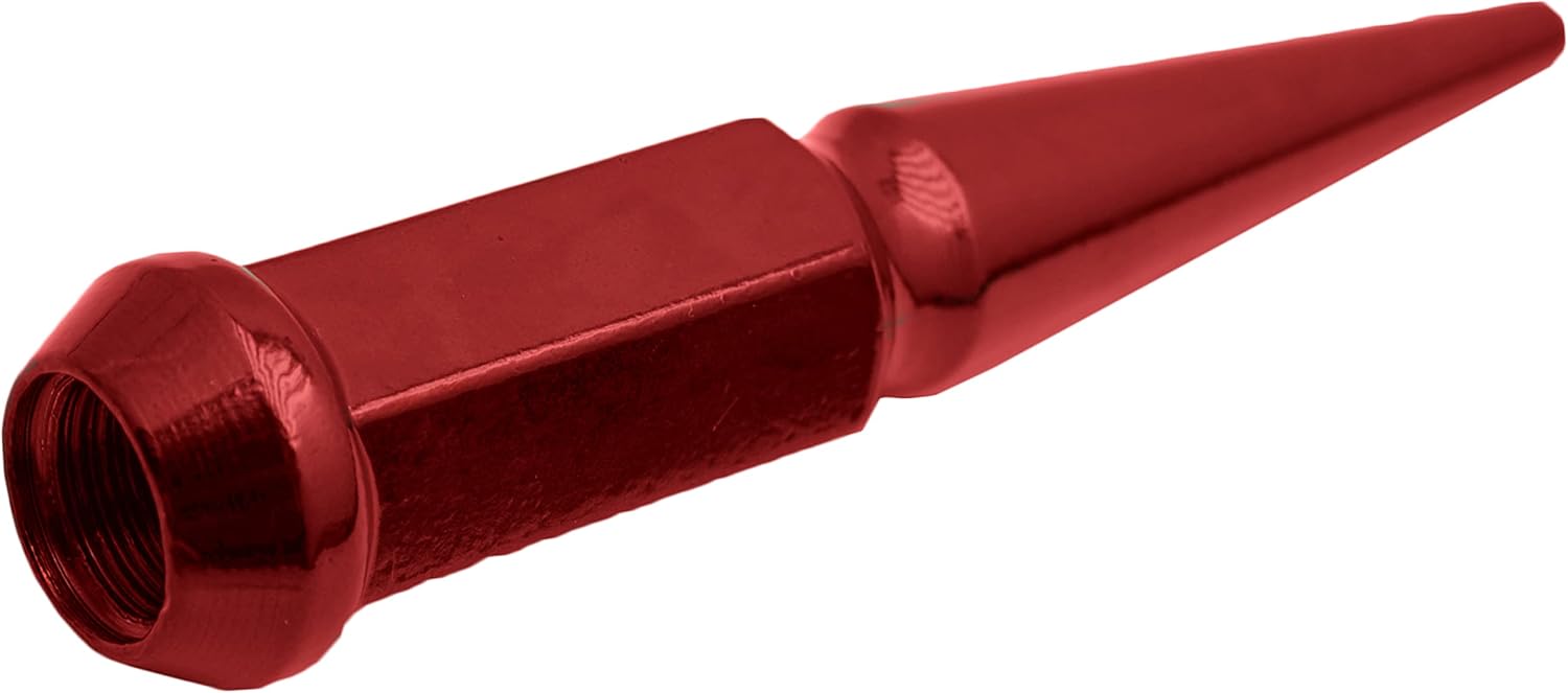 Brand New 32 Pc Set of Red " SOLID SPIKE" Metal Lug Nuts. 14x1.5 Trucks with aftermarket wheels. Conical seating. These lug nuts are better than our competition at a much better price. Spike Lug nuts are THE HOTTEST aftermarket lug nuts in the market. Made out of SCM 435 Cold Forged Steel, 1 Piece construction. These lug nuts require a special socket to install them. At the same time it adds security to your wheels. You need the special long socket to remove them. We also carry this item in chrome and less quantity. To install them, hand torqueing them is best. Any questions , Feel free to ask Thank You