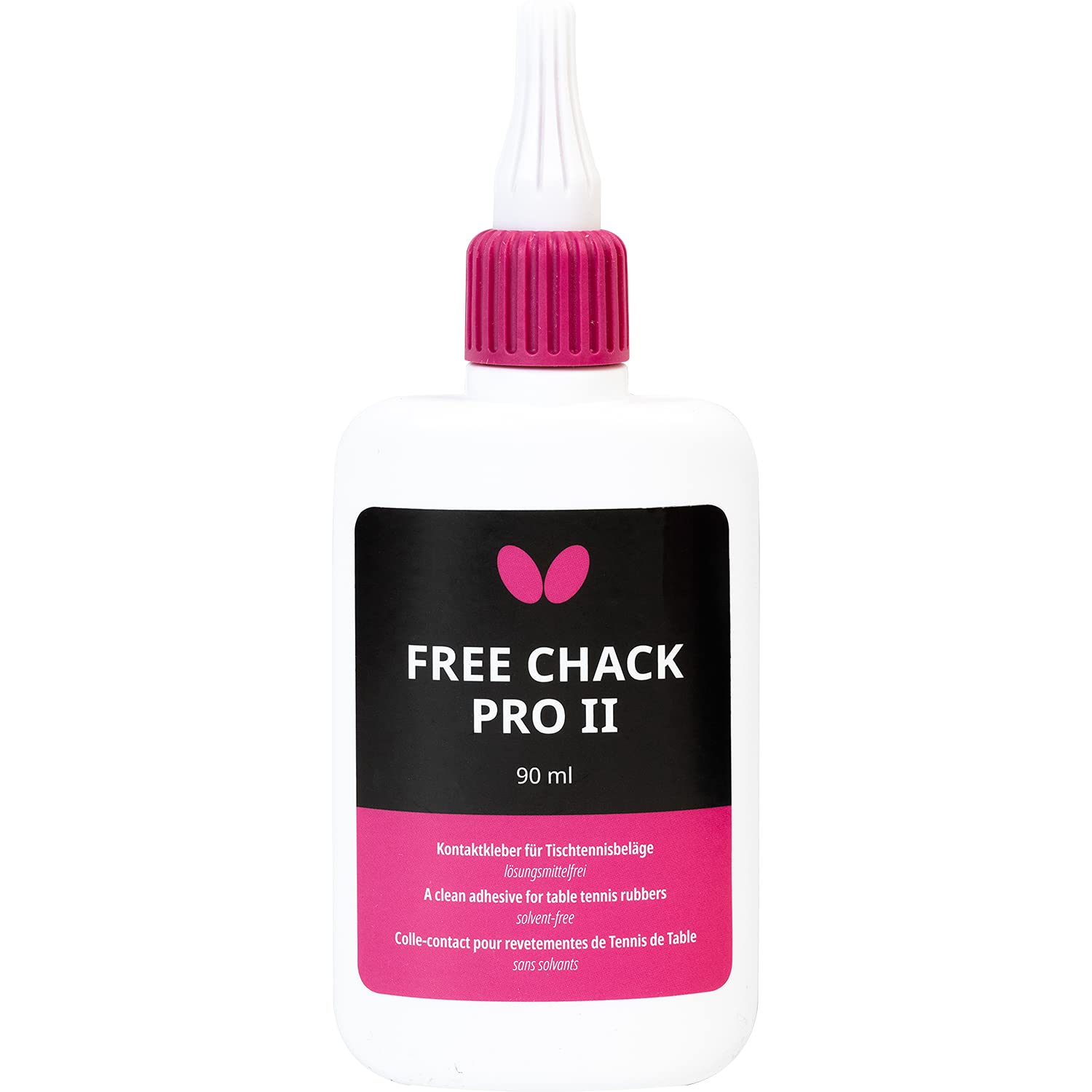 Butterfly Free Chack Pro II Table Tennis Glue is the newest advancement in adhesive technology. This latex-based glue immediately affixes your rubber to your blade due to the shortened drying time. Players will notice exceptional power right after assembly. In addition, Free Chack Pro II maximizes dwell time, adding both speed and spin to any rubber/blade combination. For best results, apply several drops to both the blade and the rubber, then spread evenly over the entire surface of each. Once both are dry, carefully place the rubber sheet flush with the top of the handle, paying special attention to ensure the sheet is centered on the blade. After that, gently press the rubber onto the blade to get rid of any potential air bubbles and get it perfectly flat. Once this is done, you can cut away the excess rubber, following the edge of the blade all the way around from one side to the other. Finally, after repeating this process on the other side of the blade, apply side tape to help protect the edge of the blade from accidental damage.