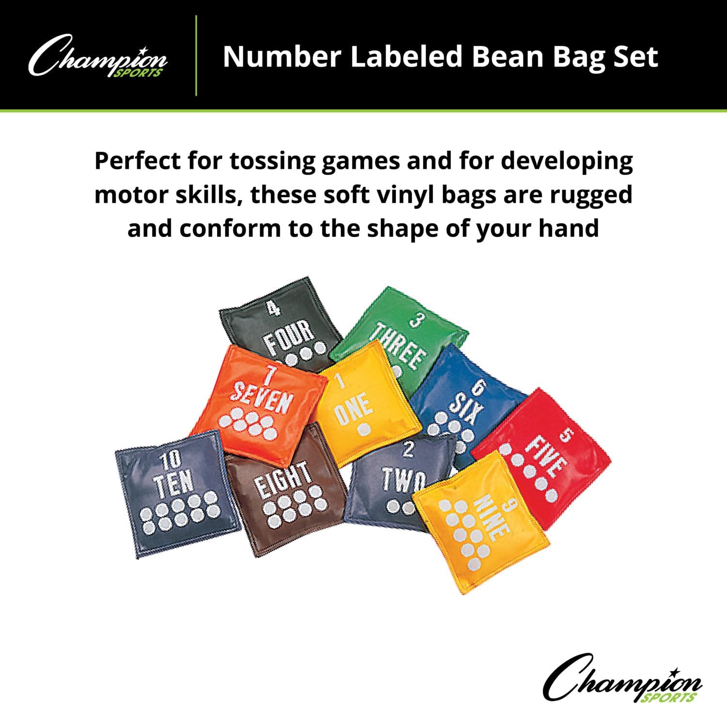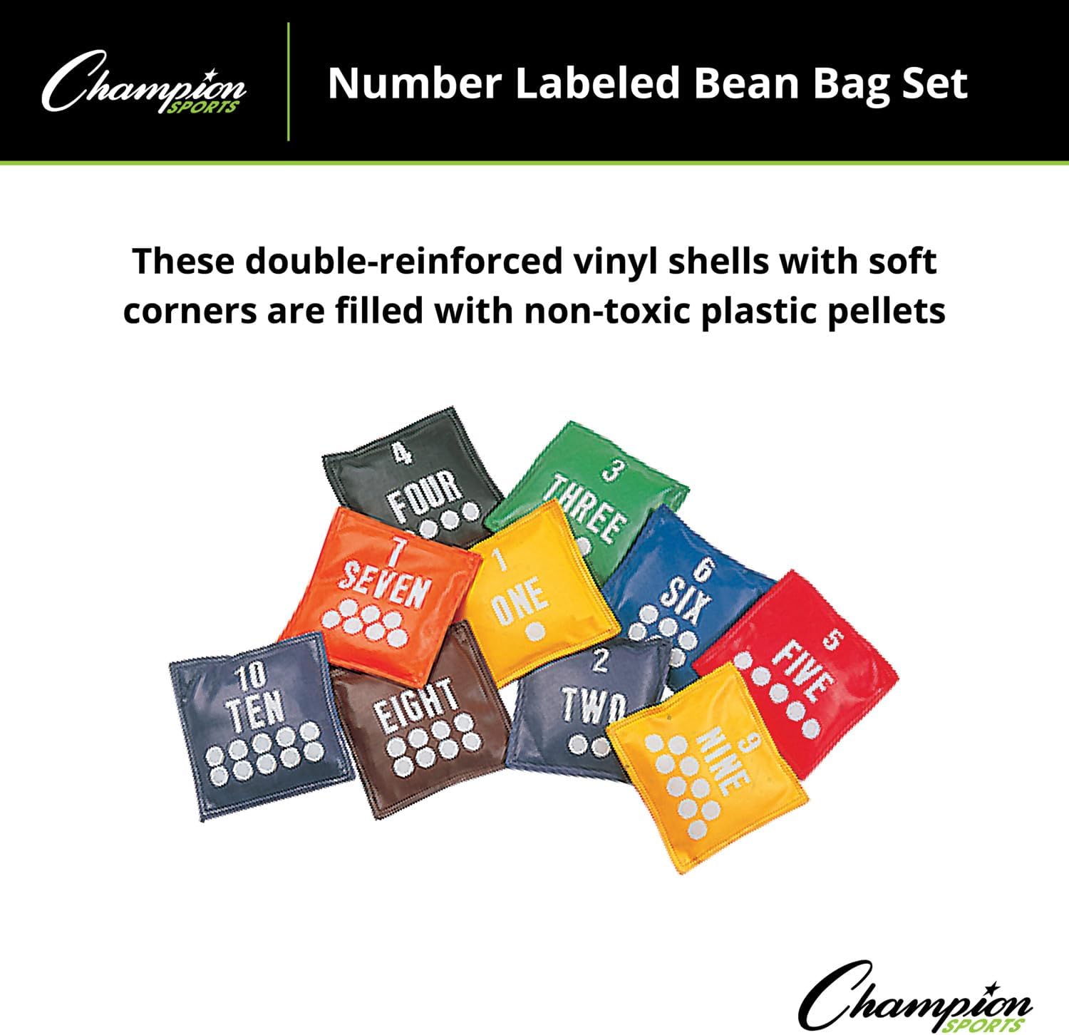 Learning numbers can be a blast with the Champion Sports Numbered Bean Bag Set. This set includes ten, 5" bean bags in assorted colors, each imprinted with a clear, easy-to-read number. Made with soft, vinyl-covered shells, these bean bags are comfortable to catch and throw, making them perfect for tossing games that develop motor skills and hand-eye coordination. Filled with non-toxic plastic pellets for safe play, these numbered bean bags are a fun way to help your child grasp basic mathematical concepts.