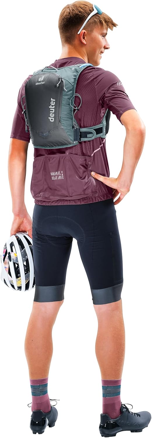 This lightweight vest-style biking backpack creates a garment-like fit for superior stability over longer distances without restricting range of movement in any way. The sternum straps together with ribcage side straps allow the volume and fit of this backpack to be cinched in precisely, for a snug fit without restricting breathing. The perforated shoulder straps, minimized use of materials, and the lightweight deuter Lite back system combine to generate maximum ventilation. Stash your energy bars, tools, and cell phone in the multiple shoulder strap pockets, while your wind shell and Streamer II 2-liter bladder (included) can go in the main compartment.