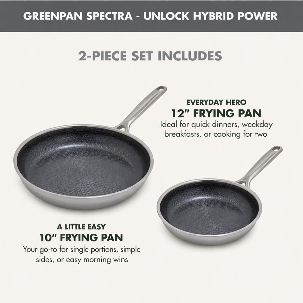 Spectra is the best of hybrid cooking, combining the strength and responsiveness of 3-ply stainless steel with the ease of our most advanced ceramic nonstick. Powered by Thermobond™, this innovative technology fuses together an etched stainless steel pattern, our PFAS-free ceramic nonstick, and a nonstick boost layer for unmatched performance. Thermobond increases durability, making it 10x more metal utensil safe*, while providing exceptional heat distribution and perfect sears. This collection is oven and broiler safe up to 850˚F (lids up to 425˚F), and optimized for all stovetops, including induction. Smart details like solid cast stainless steel handles and chip-free pouring rims offer total control and mess-free transfers. Plus, Spectra is dishwasher safe for an effortless cleanup. *When compared to GreenPan aluminum collections coated with Thermolon ceramic nonstick.