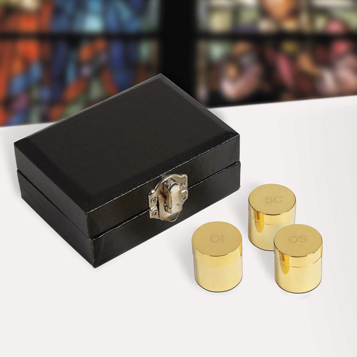 Material - Polished Brass - Case Size - 4 Inch (W) x 1 1/2 Inch (H) x 3 Inch (D) - Includes 3 Oil Stocks in a Storage or Carrying Case - Oil Stocks are Inscribed with OI, OS, and SC on the Lid - These are Perfect for Travel or Use in a Church