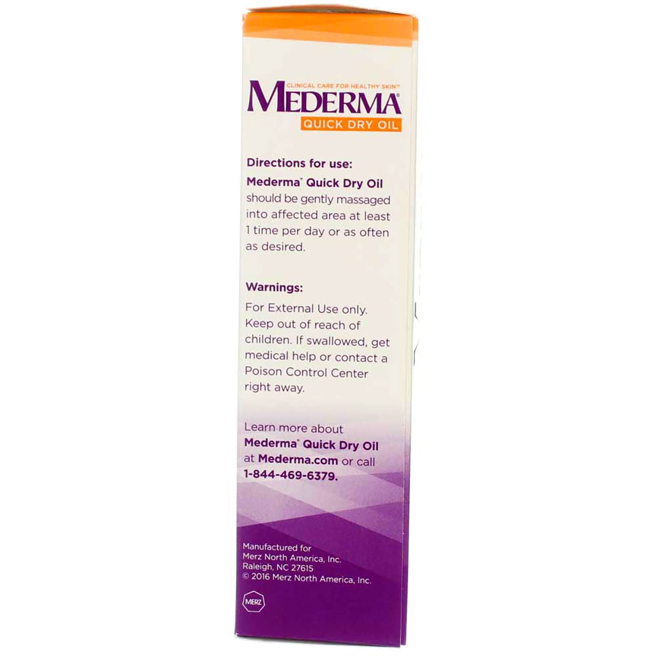 Mederma Quick Dry Oil contains a complex blend of natural oils and botanicals. Sweet Almond oil helps to nourish and moisturize. Rose Hip oil, rich in Vitamin C, is a natural skin brightener which helps improve skin tone. Sunflower oil helps to maintain skin's natural moisture level. Coconut oil helps to seal in moisture while creating luxuriously soft, hydrated skin. Chamomile and Ginger extracts help soothe and reduce blotchiness. Mederma Skin care quick dry oil for stretch marks, fast absorbing formulation. Formulated to improve the appearance of scars, stretch marks, uneven skin tone and dry skin mineral oil free. Fragrance Free. Paraben Free. Dye Free. Rich in vitamins A, E and Omega 3. For healthier looking skin.