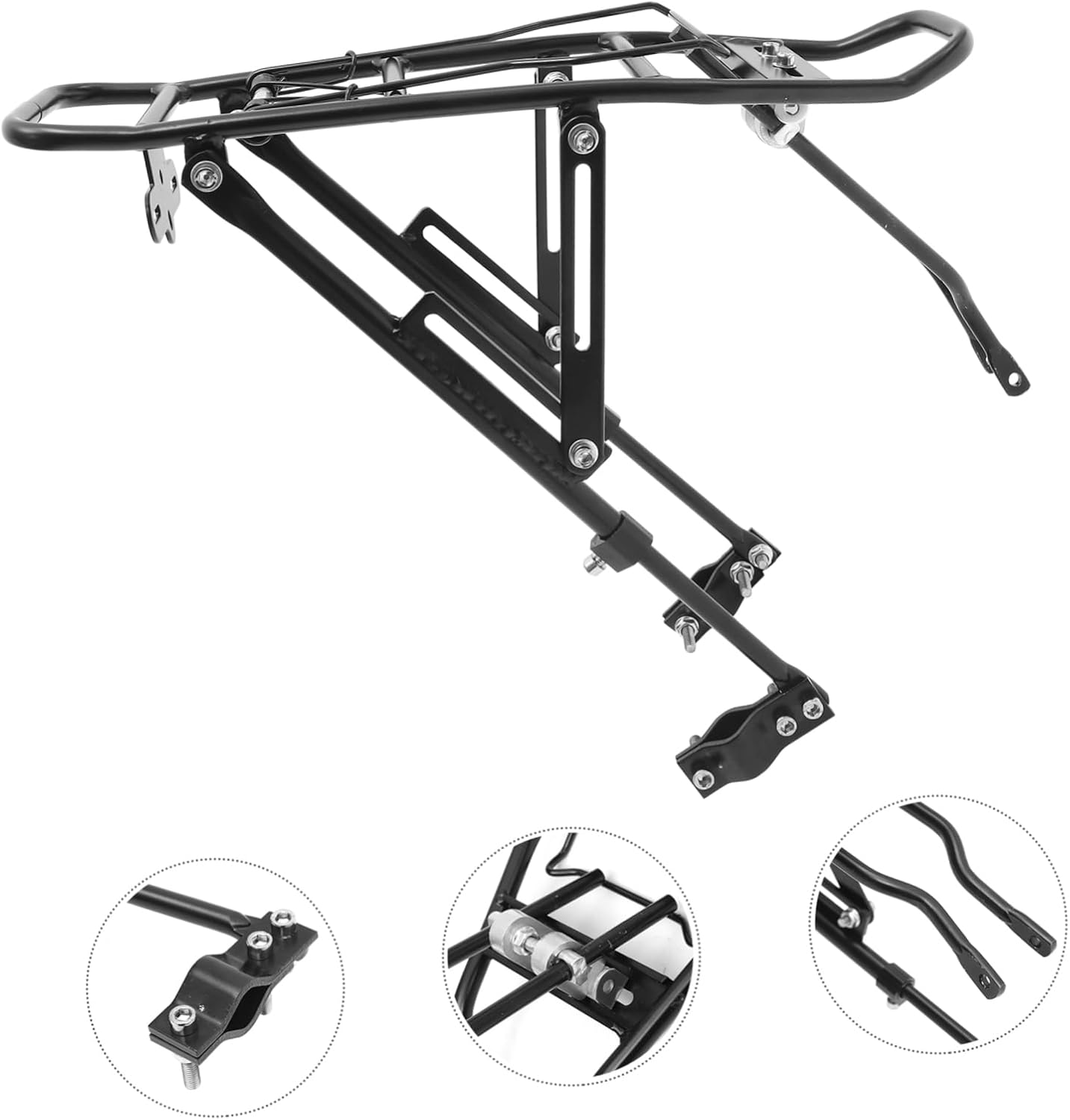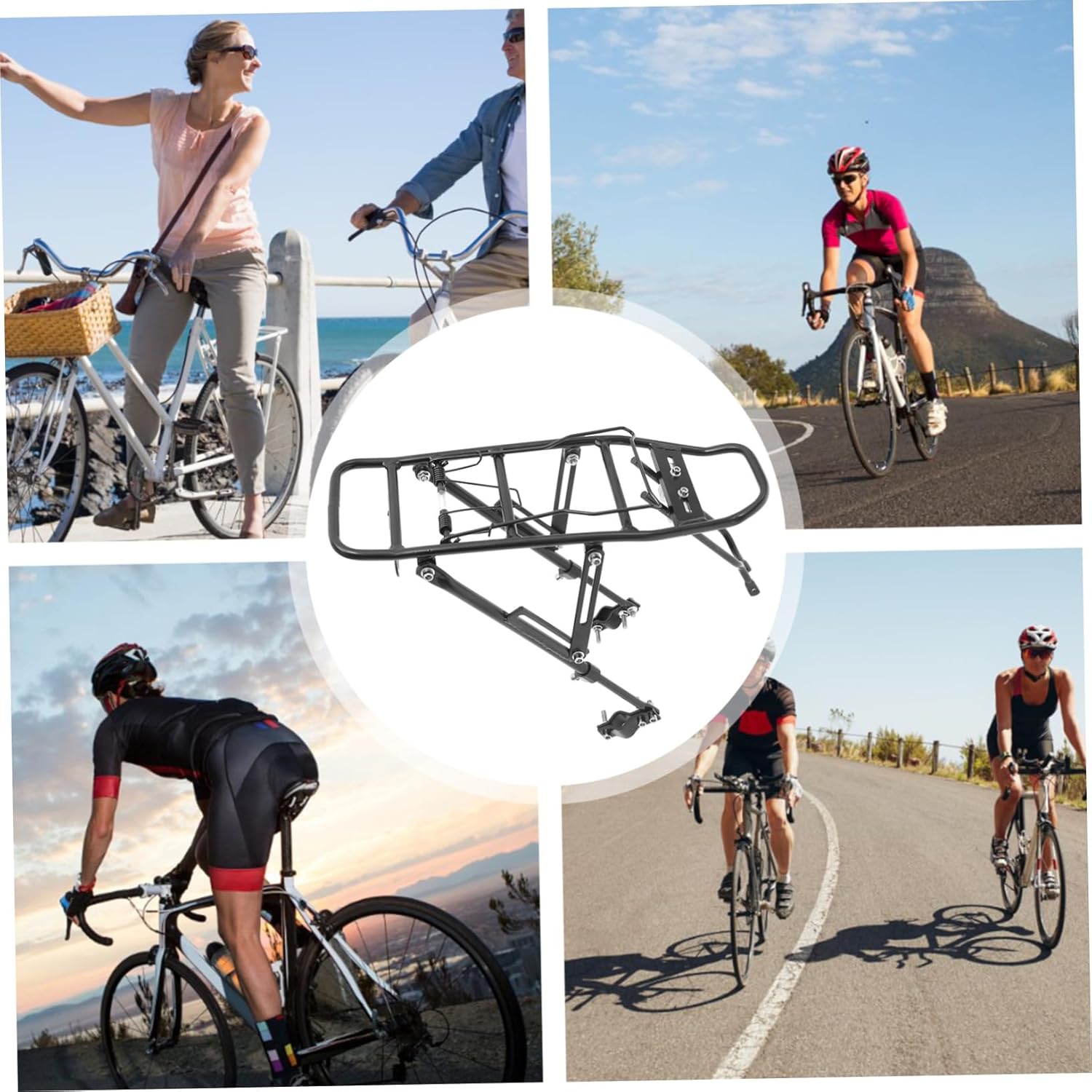 Package Include 1 x Bike cargo rack Characteristics - Color: Black cycling rack. - Material: Aluminum alloy bike cargo rack. - Size: About 38.5x14.5x1 cm. - Adjustable, alomost universal, suitable for most bike, including mountain bikes, road bikes, etc rack. - for use with panniers, backpacks, baskets, etc rack rear. - Easy installation and removal luggage rack. - Well made of and sturdy aluminum alloy, heavy-duty, durable for long hours cargo rack.Goods Information is suitable for most bikes and for use with panniers, backpacks, baskets, etc.bike cargo rack Are you looking a rear cycling rack? This cargo rack might be a choice for you! Made of alloy, it is heavy-duty and durable for long-lasting use.cycling rack A and helpful companion for cycling!