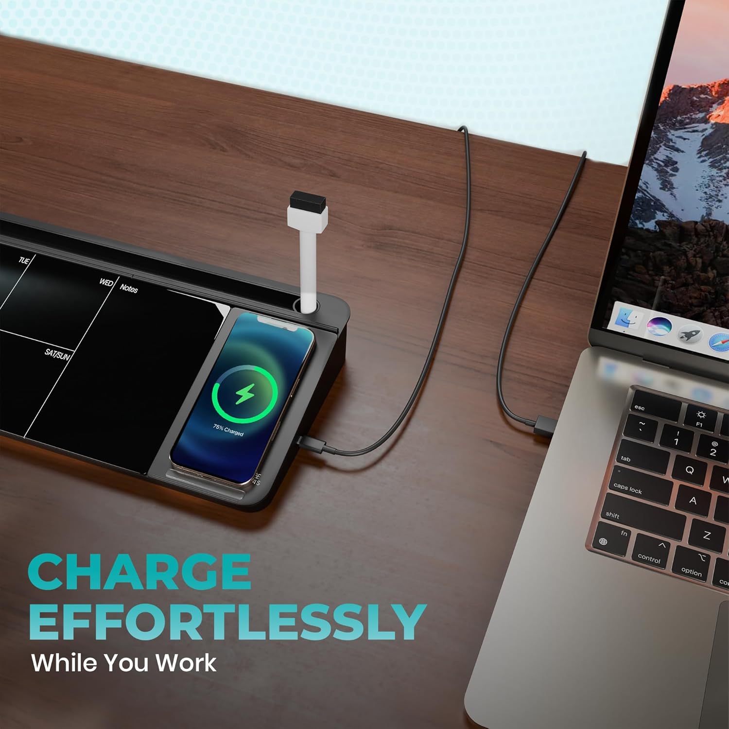 Upgrade your workspace with this all-in-one glass desk whiteboard. Featuring a built-in weekly calendar and notes section, easily manage tasks and reminders in one place. The integrated 18W wireless charging station powers your devices quickly, eliminating extra cords with the included USB-C cable. The slanted glass whiteboard fits perfectly between your keyboard and monitor, providing a comfortable, stain-resistant writing surface. With handy storage compartments for pens, markers, and more, you’ll keep essentials organized and within reach. Includes a dry erase marker, eraser, and 16 x 6.7 x 2.7-inch glass whiteboard, ready to use out of the box. **The built-in 18W wireless charger is designed for fast charging with compatible devices. For optimal results, use the included high-quality USB-C cable and pair it with a power adapter that supports 18W or higher. Ensure your phone is properly aligned on the charging pad, and note that some phone cases may affect charging efficiency. Charging speed may vary based on your device's capabilities and setup.