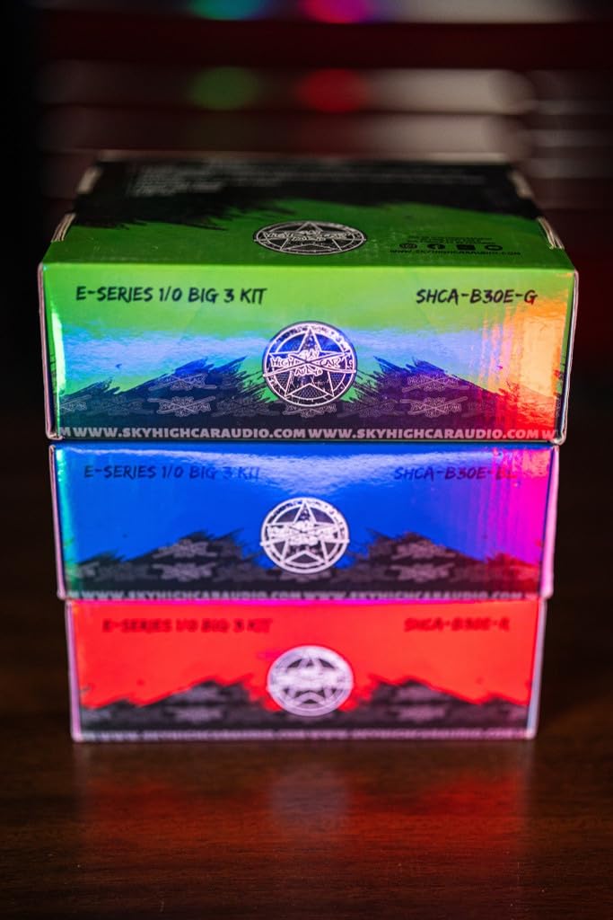 The Sky High Car Audio E-Series Big 3 Upgrade Kit is designed to improve your vehicle’s electrical system by reinforcing the three primary power and ground connections. By upgrading these critical pathways—alternator to battery, battery to chassis, and engine to chassis—this kit helps support more consistent current flow and improved voltage stability for car audio systems and other electrical upgrades. Built with oversized Copper-Clad Aluminum (CCA) wire, the E-Series offers a balance of flexibility and performance, making it suitable for a wide range of vehicles and installations. The flexible insulation allows for easier routing through engine bays and tight spaces, while the cable size options let you choose the right setup for your system. Each kit includes three 4-foot cables to cover the essential Big 3 connections. One end of each cable is pre-terminated with a ring terminal for convenience, while the opposite end is left open so you can cut to length and complete the installation using the included terminals and heat shrink. This design allows for a more tailored fit depending on your vehicle layout. This listing offers multiple configurations, including 1/0 gauge and 4 gauge options, as well as color variations such as Red/Black, Blue/Black, and Green/Black. These options make it easy to match your build while keeping power and ground wiring clearly organized. The Sky High Car Audio E-Series Big 3 Upgrade Kit is ideal for amplifier installations, electrical upgrades, and improving overall system efficiency in vehicles running additional power demands.