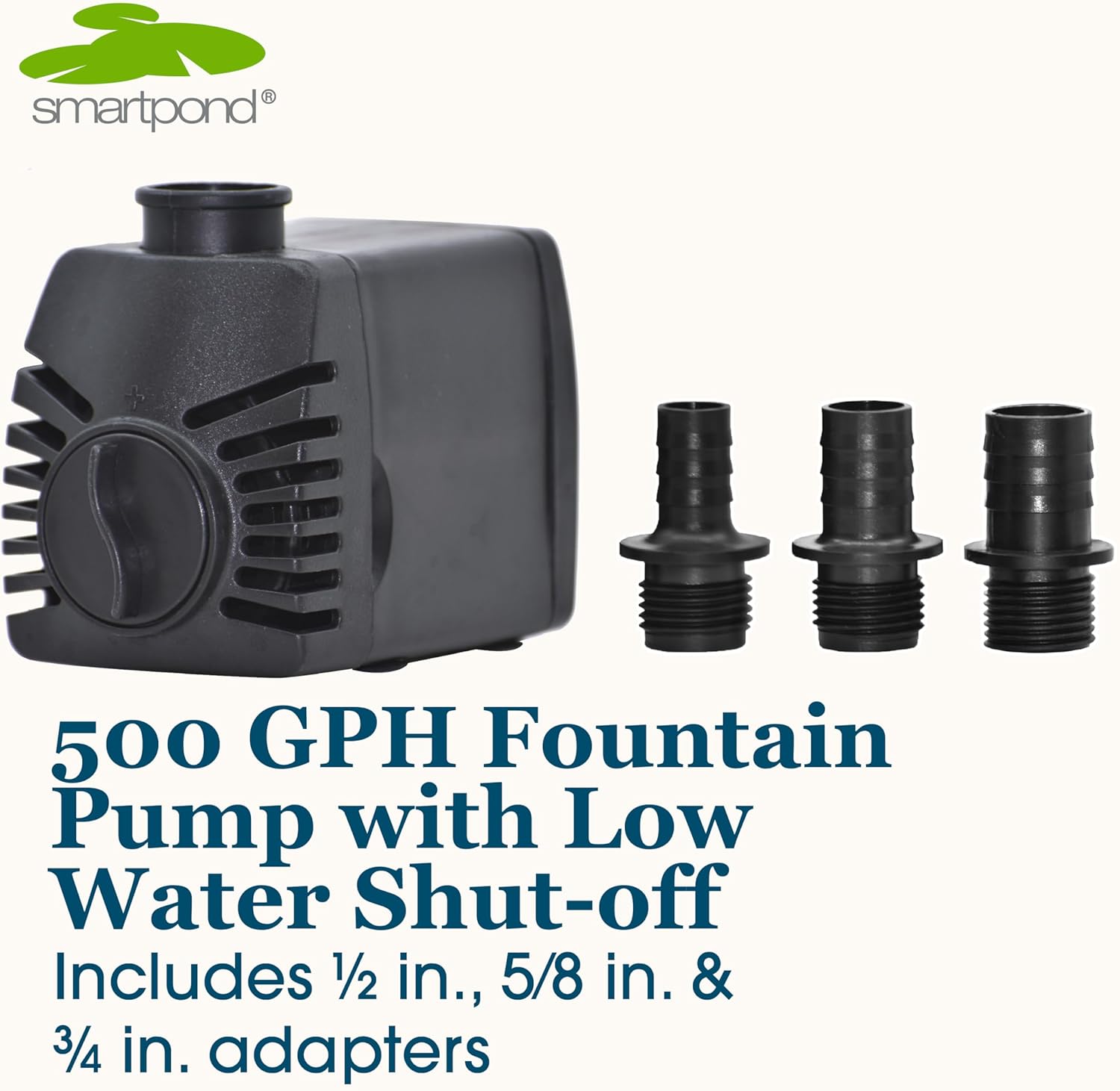 Say goodbye to worrying about pump burnout, thanks to the smartpond Fountain Pump with Low Water Shut-off. These innovative pumps are designed to turn off when water levels are too low and turn back on when water is added, ensuring they never run dry and prolonging their lifespan. This powerful pump circulates 500 gallons per hour, keeping the water in your feature moving efficiently. They also include an adjustable flow control, allowing you to customize the water flow from a gentle trickle to a robust flow for an impressive water display. Ideal for large fountains, custom water features, or powering hydroponics systems, these versatile pumps connect easily using ½, ⅝, or ¾ in. ID tubing (adapters included). For ease of placement in your yard, this pump comes with a 16 ft. power cord. Despite their compact size, these pumps are powerful, durable, and designed to save energy while operating quietly. Enjoy the sights and sounds of your water feature without interruption, backed by a 2-year manufacturer's warranty.