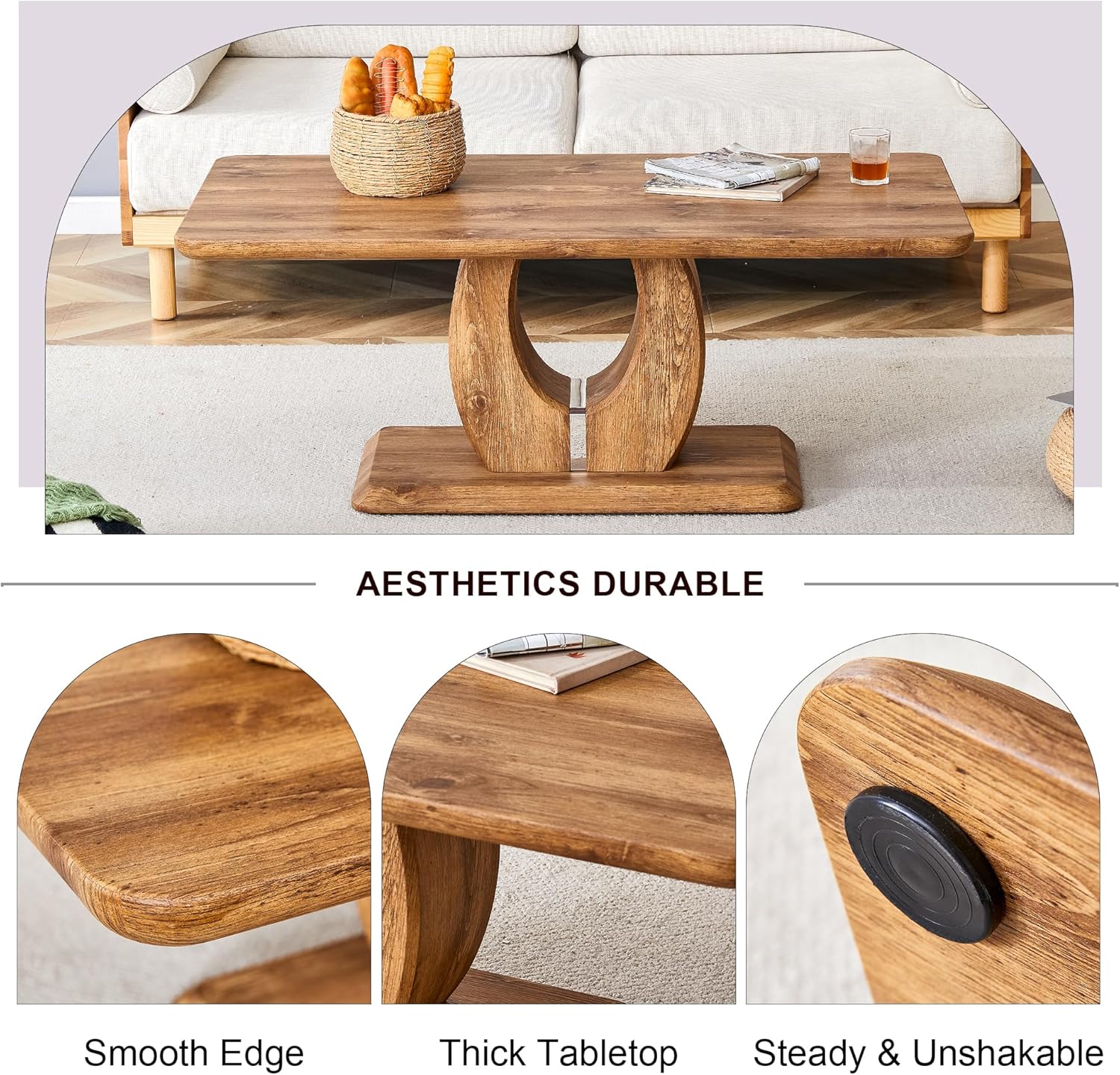 【Magnificent Wood Mastery】Our modern coffee table range elevates any space with its grandeur. From the expansive 47" coffee table to the compact coffee tables for small spaces, each piece is crafted with a faux wood tabletop that marries durability with luxury coffee table aesthetics. With dimensions like 47"x25.6"x18", our tables offer ample surface area without overwhelming your living room.【Brown Coffee Table: A Modern Marvel】Dive into the contemporary elegance with our coffee table. Its modern rectangular silhouette and muted color palette cater to a modern coffee table for living room setting, offering a seamless blend of style and functionality. It’s perfect for those who admire the understated sophistication of a modern rectangle brown coffee table.【Small Space, Grand Impact】Our small coffee tables for living room prove that limited space need not restrict luxury. The wood MDFpattern top is especially suited for intimate spaces, providing the luxury of a modern coffee table without the bulk. Our tea table for living room selections, although compact, are big on style.【Living Room Luxe】The living room is the heart of the home, and ourcoffee tables for living room modern settings are its pulse. Whether you opt for a wood coffee table or a lighter modern coffee table, each brings a touch of opulence to your modern coffee furniture for living room.【Dining and Entertaining Delights】For the dining room or entertainment area, the coffee table doubles as a conversation piece. Pair it with a rectangular center table or a luxury modern coffee table to elevate dinner parties or game nights.【Work from Home with Style】In home offices, the modern rectangle coffee table serves as a stylish workstation, complementing your mid century modern living room furniture. Its sturdy mdf tabletop ensures durability even during the busiest of days.【Bedroom Elegance】Transform your bedroom with a modern sofa coffee table at the foot of the bed or a tea table by the window. They serve as the perfect backdrop for a quiet morning coffee or an evening unwind.【Outdoor Oasis】Take the luxury outdoors with our weather-resistant modern farmhouse coffee table for living room selections. Ideal for patios or balconies, these pieces resist the elements while maintaining their stylish appeal.【Customer Commitment】Our commitment to satisfaction doesn’t end with the sale. Each coffee table is backed by customer service that's as dependable as the MDF frame supporting each table. We ensure that your investment into our modern coffee tables for living room is met with unmatched support and care.【A Table for Every Occasion】Our range is as versatile as your life. Whether it's the center table for living room modern gatherings, a tea table for living room tranquility, or a sidekick to your sofa coffee table, our collection accommodates every scenario with grace and ease.